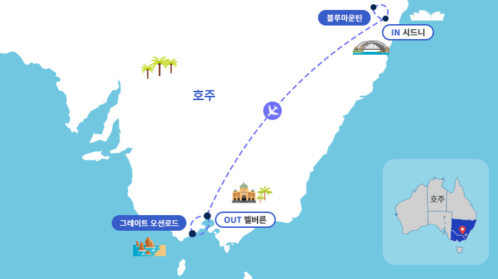 멜버른 : <오크스온마켓 또는 동급>■ 객실 사용 안내 - 성인 2인 1실 기준 / 1객실 최대 3인 투숙 가능 - 3인 1실 투숙 시 : 2싱글 1엑스트라베드 / 1더블 1엑스트라베드 / 2더블 중 랜덤 배정 예정■ 관광지 - 블루마운틴 : 시닉 3종 탑승 포함 블루마운틴 전경 감상 - 시드니 핵심 시내관광 : 하버브릿지, 오페라하우스, 미세스 맥콰리체어 등 - 메트로폴리탄 속의 유럽 멜버른 시내관광 - 장대한 자연의 파노라마 12사도 그레이트 오션 로드, 벨스비치, 아드고지해안, 런던브릿지