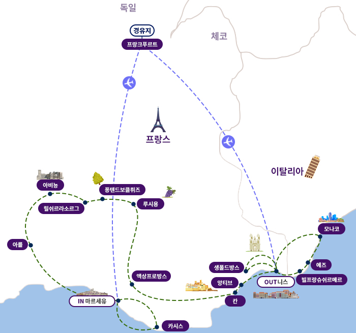 인천-프랑크푸르트-마르세유(1)-카시스-마르세유(1)-아를-아비뇽(1)-릴쉬르라소르그-퐁텐드보클뤼즈-루시용-엑상프로방스(1)-칸-앙티브-니스(1)-생폴드방스-니스(1)-빌프랑슈쉬르메르-에즈-모나코-니스(1)-기내박(1)-인천
