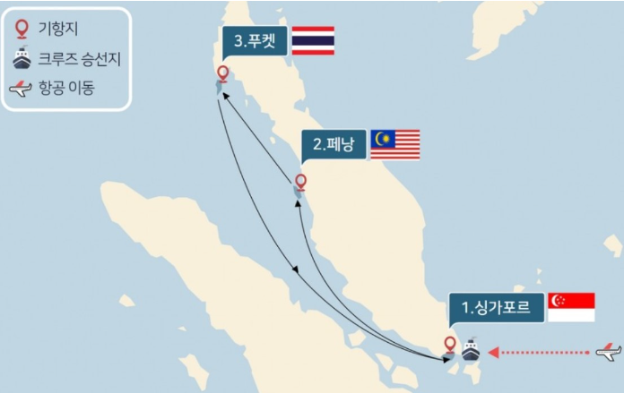 ★ 객실지정은 선사 고유의 권한으로 무작위 배정됩니다. [도시 안내] ▶ 동남아시아 최고의 부국이며 세계 경제의 중심지 동남아시아 크루즈의 허브도시 싱가포르 관광▶ '동양의 진주'라는 별칭답게 다채로운 볼거리와 훌륭한 관광 인프라로 가득한 페낭 관광▶ 전세계인이 사랑하는 10대 휴양섬 리스트에 매년 이름을 올리는 세계적인 휴양명소 푸켓 관광